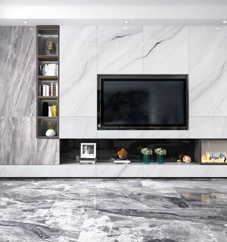 該背景墻選材于意大利北部Bergamo(貝爾格蒙)山脈中的Orobico (奧比克)大理石材。其礦脈紋理猶如臥山踞龍,貴不可言,整體紋理氣勢磅礴,暗藏龍氣,寓意龍騰四方、吉祥如意。